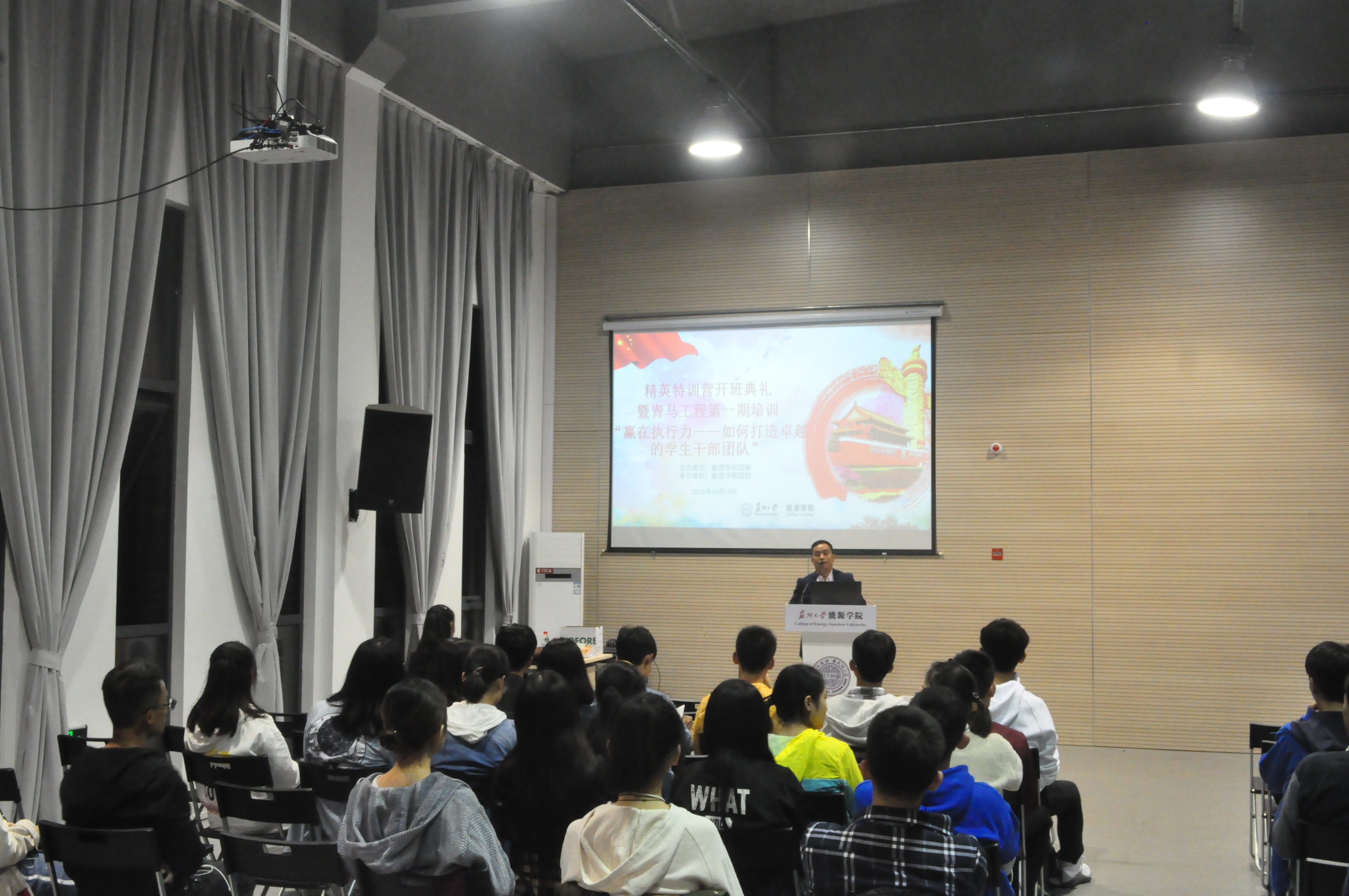精英特训营开班典礼暨青马工程第一期培训“赢在执行力——如何打造卓越的学生干部团队”在东区新能源大楼多功能厅举行。活动由澳门赌场团委书记张振华主讲。澳门赌场2017级、2018级所有班委和院各学生组织全体学生干部参加了活动。